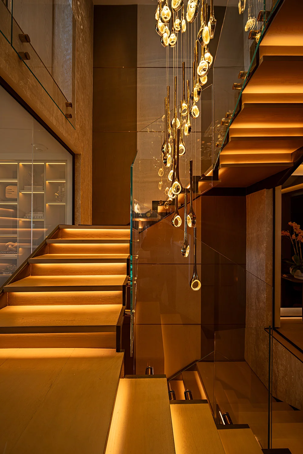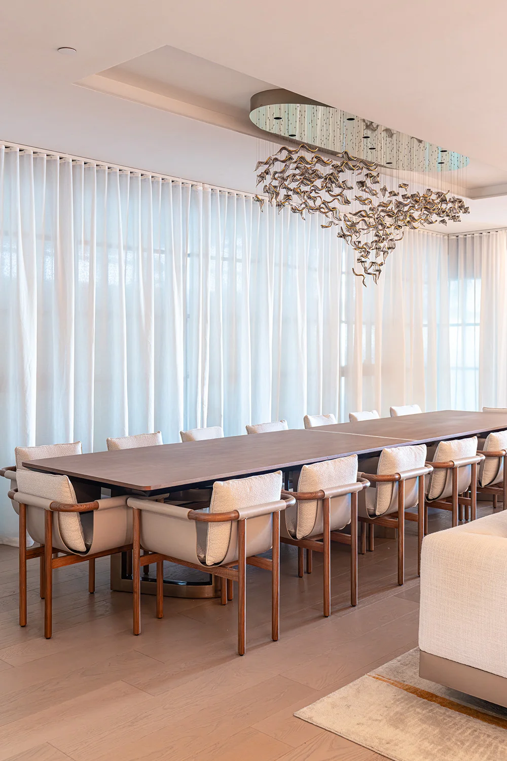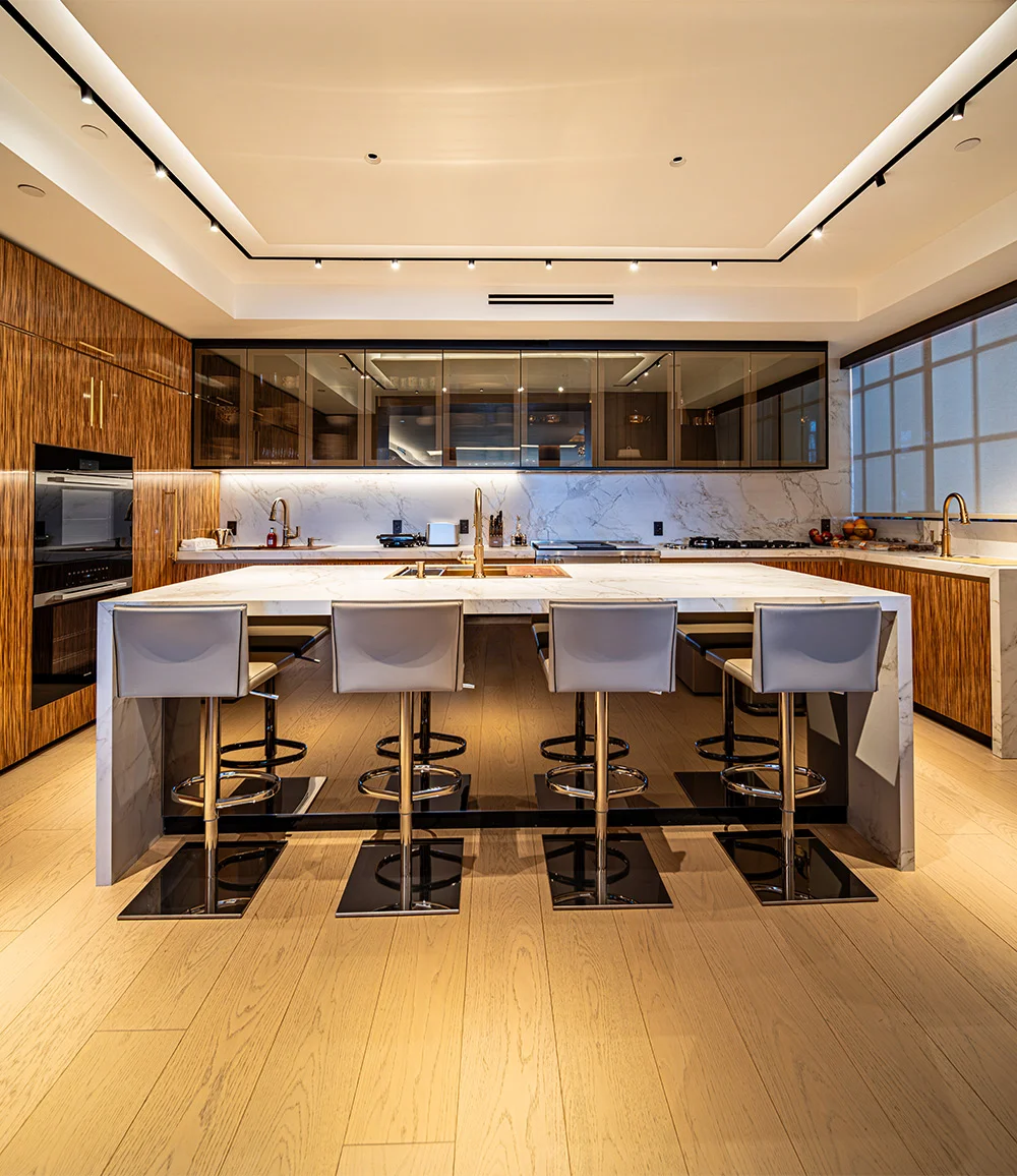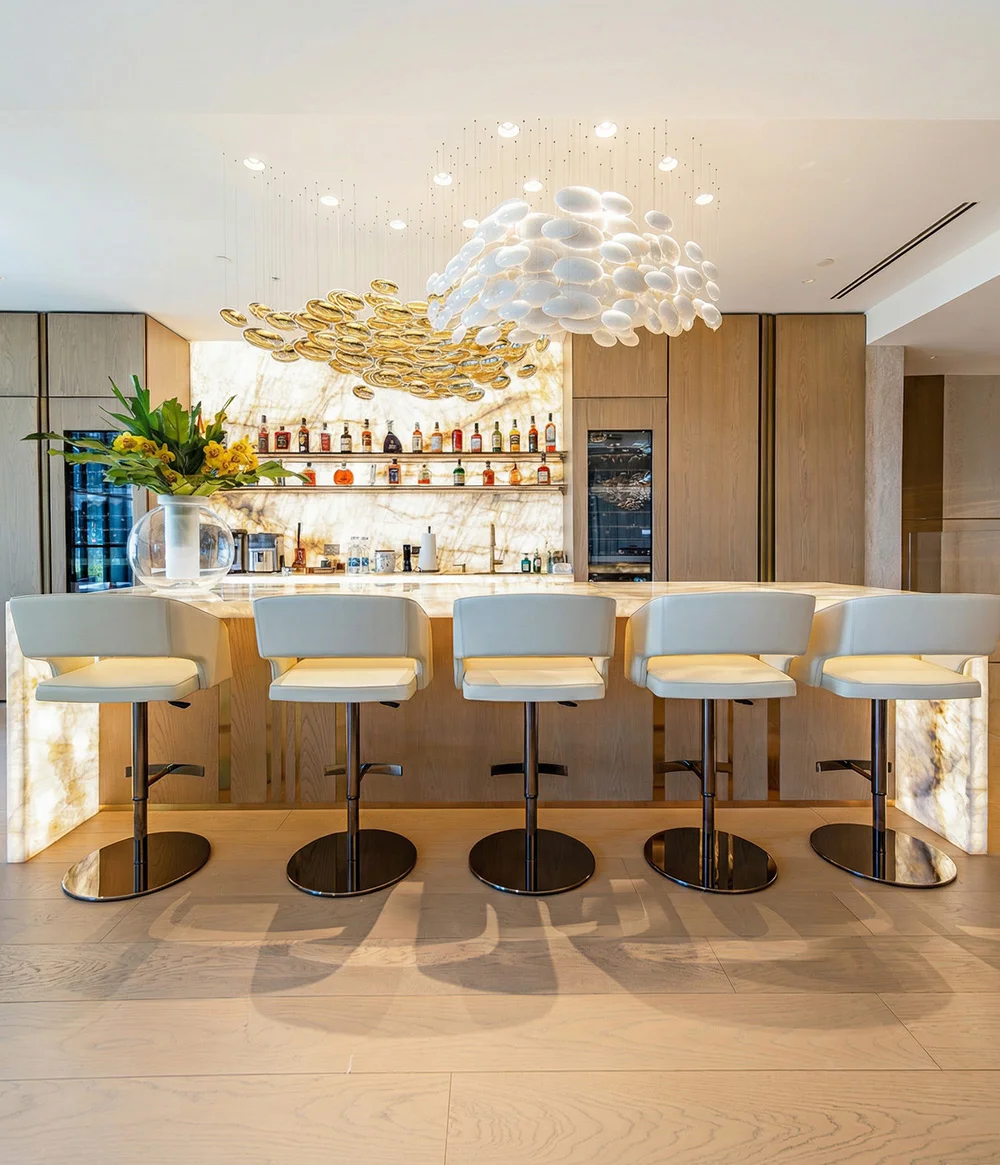 Rita Chraini unveils a full-scale renovation of a 7,000 sq ft penthouse at Artes Surfside, Miami—a residence where refined French sophistication is seamlessly blended with the serenity of oceanfront living. At the heart of the design lies a dramatic onyx bar with bespoke backlighting, creating a luminous focal point that anchors the main living space. Overlooking it, a handcrafted crystal chandelier by Sans Souci Lighting cascades gracefully through the staircase, functioning as both sculpture and light installation. Rita curated a selection of exceptional furnishings from Fendi Casa, Minotti by DDC, and Roche Bobois, shaping an interior that feels timeless, polished, and meticulously tailored. A standout moment is the iconic Louis Vuitton Cocoon hanging chair from the Objets Nomades collection—an avant-garde piece that introduces both artistry and movement, perfectly framing the penthouse's sweeping views of the Atlantic. The result is a residence of rare harmony—architectural precision, luxurious materials, and curated design elements brought together to create a coastal sanctuary of unmistakable elegance.